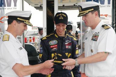 | Keywords: US Navy 070728-N-5362H-052 Rear Adm. Bruce Clingan receives a command ball cap from Cmdr. John Harber, intel officer aboard USS Carl Vinson (CVN 70) during a meet and greet with Navy NASCAR team driver Brad Keselowski.jpg en INDIANAPOLIS July 28 2007 Rear Adm Bruce Clingan receives a command ball cap from Cmdr John Harber intel officer aboard USS Carl Vinson CVN 70 during a meet and greet with Navy NASCAR team driver Brad Keselowski before the Kroger 200 Bush series race at the O'Reilly Raceway Park in Indianapolis Clingan and seven Sailors from Carl Vinson attended the race as the Fleet Honorary to cheer on the number 88 Navy Chevy Monte Carlo U S Navy photo by Mass Communication Specialist Seaman Nina Hughes RELEASED 2007-07-28 070728-N-5362H-052 Navy http //www navy mil/view_image asp id 48825 U S Navy photo by Mass Communication Specialist Seaman Nina Hughes PD-USGov-Military-Navy 2007 in Indianapolis Military in Indianapolis Aboard USS Carl Vinson CVN-70 O'Reilly Raceway Park Bruce W Clingan |