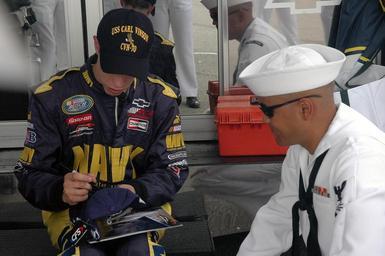 Keywords: US Navy 070728-N-3705H-186 Navy NASCAR team driver, Brad Keselowski, signs an autograph for a Sailor assigned to Nimitz-Class aircraft carrier USS Carl Vinson (CVN 70) during a meet-and-greet session before the Kroger 200 Busch.jpg en INDIANAPOLIS July 28 2007 - Navy NASCAR team driver Brad Keselowski signs an autograph for a Sailor assigned to Nimitz-class aircraft carrier USS Carl Vinson CVN 70 during a meet-and-greet session before the Kroger 200 Busch Series race at O'Reilly Raceway Park Seven Vinson Sailors attended the race to cheer on the No 88 Navy Chevy Monte Carlo U S Navy photo by Mass Communication Specialist Nina Hughes RELEASED 2007-07-28 070728-N-3705H-186 Navy http //www navy mil/view_image asp id 48840 U S Navy photo by Mass Communication Specialist Nina Hughes PD-USGov-Military-Navy 2007 in Indiana O'Reilly Raceway Park Aboard USS Carl Vinson CVN-70 Brad Keselowski in 2007 Military in Indianapolis |