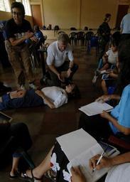 | Keywords: US Navy 070729-N-6278K-190 Lupe Diaz, a Project Hope certified nurse midwife, and Bob Leitch, medical director for the Project Hope detachment aboard Military Sealift Command hospital ship USNS Comfort (T-AH 20), demonstrate fi.jpg en ACAJUTLA El Salvador July 29 2007 Lupe Diaz a Project Hope certified nurse midwife and Bob Leitch medical director for the Project Hope detachment aboard Military Sealift Command hospital ship USNS Comfort T-AH 20 demonstrate first-aid techniques to community health care workers at Casa Comunal Comfort is on a four-month humanitarian deployment to Latin America and the Caribbean to provide medical treatment to patients in a dozen countries U S Navy photo by Mass Communication Specialist 2nd Class Joan E Kretschmer RELEASED 2007-07-29 070729-N-6278K-190 Navy http //www navy mil/view_image asp id 48850 U S Navy photo by Mass Communication Specialist 2nd Class Joan E Kretschmer PD-USGov-Military-Navy Acajutla Education in El Salvador USNS Comfort in El Salvador 2007 |