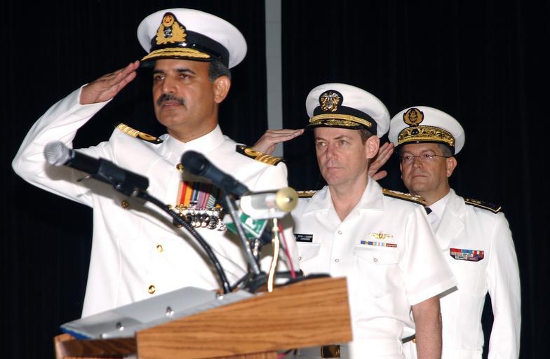 Keywords: US Navy 070801-N-7095C-001 Pakistani Commodore Khan Hasham Bin Siddique, Vice Adm. Kevin Cosgriff and French Rear Admiral Alain Hinden salute their flags during the Combined Task Force (CTF) 150 change of command ceremony.jpg en MANAMA Bahrain Aug 1 2007 - Pakistani Commodore Khan Hasham Bin Siddique Vice Adm Kevin Cosgriff and French Rear Admiral Alain Hinden salute their flags during the Combined Task Force CTF 150 change of command ceremony The ceremony marks the second time Pakistan takes the helm of CTF-150 and marks the conclusion of France s fourth time leading the Coalition task force CTF-150 established near the beginning of Operation Enduring Freedom conducts Maritime Operations MO in the Gulf of Aden Gulf of Oman the Arabian Sea Red Sea and the Indian Ocean U S Navy photo by Mass Communication Specialist 3rd Class Seth Clarke RELEASED 2007-08-01 070801-N-7095C-001 Navy http //www navy mil/view_image asp id 48912 U S Navy photo by Mass Communication Specialist 3rd Class Seth Clarke PD-USGov-Military-Navy Kevin Cosgriff US Navy in Manama Bahrain Change of command Combined Task Force 150 Admirals of France Admirals of Pakistan Salutes |