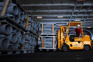 Keywords: US Navy 070818-N-2659P-066 Aviation Ordnanceman 3rd Class Corey Gray, from weapons department, transports crates of ammunition through the hangar bay of Nimitz-class aircraft carrier USS John C. Stennis (CVN 74).jpg en PACIFIC OCEAN Aug 18 2007 - Aviation Ordnanceman 3rd Class Corey Gray from weapons department transports crates of ammunition through the hangar bay of Nimitz-class aircraft carrier USS John C Stennis CVN 74 to Military Sealift Command ammunition ship USNS Flint T-AE 32 during a weapon offload The weapons offload consisted of the movement of ordnance from Stennis to Flint over a two-day period Stennis is on a scheduled deployment to promote peace regional cooperation and stability U S Navy photo by Mass Communication Specialist 3rd Class Paul J Perkins RELEASED 2007-08-18 070818-N-2659P-066 Navy http //www navy mil/view_image asp id 49850 U S Navy photo by Mass Communication Specialist 3rd Class Paul J Perkins PD-USGov-Military-Navy Aviation Ordnanceman Aboard USS John C Stennis CVN-74