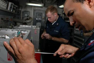 | Keywords: US Navy 070909-N-1332Y-140 Aviation Electronics Technician 1st Class Julio Suazo, right, and Aviation Electronics Technician 3rd Class James Pizzato check aviation equipment in the radar test work center aboard USS Kitty Hawk (.jpg en INDIAN OCEAN Sept 9 2007 - Aviation Electronics Technician 1st Class Julio Suazo right and Aviation Electronics Technician 3rd Class James Pizzato check aviation equipment in the radar test work center aboard USS Kitty Hawk CV 63 Kitty Hawk is more than three months into her summer deployment from Fleet Activities Yokosuka Japan U S Navy photo by Mass Communication Specialist 3rd Class Adam York RELEASED 2007-09-09 070909-N-1332Y-140 Navy http //www navy mil/view_image asp id 50701 U S Navy photo by Mass Communication Specialist 3rd Class Adam York PD-USGov-Military-Navy Aviation Electronics Technician Aboard USS Kitty Hawk CV-63 |