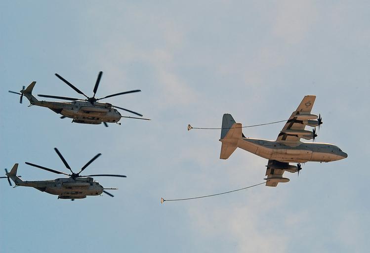 Keywords: US Navy 071014-N-0066L-030 A C-130 Hercules provides simultaneous in-flight refueling to two CH-53E Super Stallions during the Miramar air show.jpg en MIRAMAR Calif Oct 14 2007 - A C-130 Hercules provides simultaneous in-flight refueling to two CH-53E Super Stallions during the Miramar air show Each of Hercules two fuel pods can transfer up to 300 gallons per minute during in-flight refueling The 2007 Miramar Air Show focused on the joint power of military aviation by bringing Navy Marine Corps Air Force and Army assets together in one of the largest military air shows in the country U S Navy photo by Mass Communication Specialist 1st Class George Labidou RELEASED 2007-10-14 071014-N-0066L-030 Navy http //www navy mil/view_image asp id 51819 U S Navy photo by Mass Communication Specialist 1st Class George Labidou PD-USGov-Military-Navy 2007 Miramar Air Show Sikorsky CH-53E Super Stallion Aerial refueling of helicopters KC-130J Hercules United States Navy/Marine Corps |