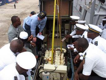 | Keywords: US Navy 071022-N-2559B-001 Engineman 2nd Class Kenneth A. Gosset leads a smallboat engineering tutorial aboard guided-missile destroyer USS Forrest Sherman (DDG 98) for members of the Congolese armed forces.jpg en POINTE NOIRE Republic of the Congo Oct 22 2007 - Engineman 2nd Class Kenneth A Gosset leads a smallboat engineering tutorial aboard guided-missile destroyer USS Forrest Sherman DDG 98 for members of the Congolese armed forces Sailors led training sessions for Congolese military personnel on search and rescue procedures damage control navigation and small boat handling throughout the week Forrest Sherman is visiting Congo and other nations as part of U S Naval Forces Europe's West and Central Africa Task Group whose goal is to improve partnerships with West and Central African nations to promote maritime safety and security initiatives U S Navy photo by Ensign Thomas A Berenato RELEASED 2007-10-22 071022-N-2559B-001 Navy http //www navy mil/view_image asp id 52243 U S Navy photo by Ensign Thomas A Berenato PD-USGov-Military-Navy United States Navy in Pointe-Noire Congo Engineman United States Navy |