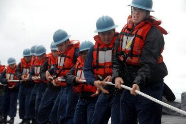 Keywords: US Navy 080126-N-8546L-048 Sailors aboard the amphibious command ship USS Blue Ridge (LCC 19) pull a line during an underway replenishment.jpg en PACIFIC OCEAN Jan 26 2008 Sailors aboard the amphibious command ship USS Blue Ridge LCC 19 pull a line during an underway replenishment Blue Ridge took on 210 000 gallons of marine diesel fuel and 12 palettes of produce while steaming at 16 knots alongside the Military Sealift Command fleet replenishment oiler USNS John Ericsson T-AO 194 U S Navy photo by Mass Communication Specialist 2nd Class Peter D Lawlor Released 2008-01-26 080126-N-8546L-048 Navy http //www navy mil/view_image asp id 54872 U S Navy photo by Mass Communication Specialist 2nd Class Peter D Lawlor PD-USGov-Military-Navy Line handlers underway replenishment Aboard USS Blue Ridge LCC-19 |