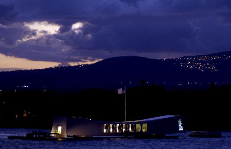 Keywords: US Navy 080704-N-6984M-244 The sun sets behind the USS Arizona (BB 39) Memorial as seen from the aircraft carrier USS Kitty Hawk (CV 63).jpg en PEARL HARBOR Hawaii July 4 2008 The sun sets behind the USS Arizona BB 39 Memorial as seen from the aircraft carrier USS Kitty Hawk CV 63 Kitty Hawk is making a port call to the United States for the first time in nearly 10 years The ship will participate in Rim of the Pacific 2008 exercise with other units from the U S Australia Chile Canada Japan the Netherlands Peru South Korea Singapore and the United Kingdom U S Navy Photo by Mass Communication Specialist 3rd Class John J Mike Released 2008-07-04 080704-N-6984M-244 Navy http //www navy mil/view_image asp id 61072 U S Navy Photo by Mass Communication Specialist 3rd Class John J Mike PD-USGov-Military-Navy Aboard USS Kitty Hawk CV-63 USS Arizona Memorial at night |