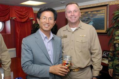 Keywords: US Navy 080713-N-1635S-003 Capt. Kenneth J. Norton, commanding officer of the Nimitz-class aircraft carrier USS Ronald Reagan (CVN 76), presents a gift of jellybeans to Governor Moon Soo Kim.jpg en PACIFIC OCEAN July 13 2008 Capt Kenneth J Norton commanding officer of the Nimitz-class aircraft carrier USS Ronald Reagan CVN 76 presents a gift of jellybeans to Governor Moon Soo Kim of Kyong Gi Do Province Republic of Korea ROK ROK government and military officials spent the day touring the ship to experience shipboard operations The Ronald Reagan Carrier Strike Group is on a scheduled deployment in the 7th Fleet area of responsibility operating in the western Pacific and Indian oceans U S Navy photo by Mass Communication Specialist 3rd Class Joshua Scott Released 2008-07-13 080713-N-1635S-003 Navy http //www navy mil/view_image asp id 61333 U S Navy photo by Mass Communication Specialist 3rd Class Joshua Scott PD-USGov-Military-Navy Kenneth J Norton Captain's cabin of USS Ronald Reagan CVN-76 Jelly beans Guests aboard USS Ronald Reagan CVN-76 Kim Moon-Soo |
