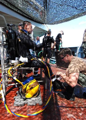 MAKE A MEME View Large Image Navy 080721-N-4044H-100 Builder 1st Class Jon Karulf prepares Lt. Li Ping Sung, executive officer of Underwater Construction Team (UCT) 1 and commander, Task Group 367.1.3, to enter the water.jpg en ODESSA Ukraine July 21 2008 Builder 1st ...