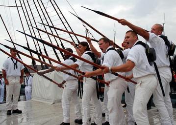 Keywords: US Navy 080815-N-9793B-001 USS Constitution's boarding pike team demonstrates an early 19th century drill Sailors and Marines used to repel enemies from boarding the ship during the USS Constitution vs. HMS Guerriere Battle Com.jpg en CHARLESTOWN NAVY YARD Mass Aug 15 2008 USS Constitution's boarding pike team demonstrates an early 19th century drill Sailors and Marines used to repel enemies from boarding the ship during the USS Constitution vs HMS Guerriere Battle Commemoration More than 65 guests and military officials joined the captain and crew for this second annual observance of the battle Constitution earned her nickname Old Ironsides Aug 19 1812 when 18-pound iron round shot from the British frigate bounced harmlessly off her oak hull U S Navy photo by Seaman Brian M Brooks/Released 2008-08-15 080815-N-9793B-001 Navy http //www navy mil/view_image asp id 62743 U S Navy photo by Seaman Brian M Brooks PD-USGov-Military-Navy Boston Navy Yard |