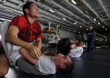 | Keywords: US Navy 080905-N-8534H-003 Electronics Technician 3rd Class Khristopher Gonzalez displays his offensive ground game to Ship's Serviceman Seaman Brandon Benjamin during a mixed-martial arts training session aboard the aircraft c.jpg en PACIFIC OCEAN Sept 5 2008 Electronics Technician 3rd Class Khristopher Gonzalez displays his offensive ground game to Ship's Serviceman Seaman Brandon Benjamin during a mixed-martial arts training session aboard the aircraft carrier USS George Washington CVN 73 George Washington is training with Carrier Air Wing CVW 5 during its transit to Japan George Washington is en route to Yokosuka Japan where the ship will replace USS Kitty Hawk CV 63 as the U S Navy's only forward-deployed aircraft carrier U S Navy photo by Mass Communication Specialist 2nd Class Barry Hirayama/Released 2008-09-05 080905-N-8534H-003 Navy http //www navy mil/view_image asp id 63666 U S Navy photo by Mass Communication Specialist 2nd Class Barry Hirayama PD-USGov-Military-Navy Electronics Technician Aboard USS George Washington CVN-73 |