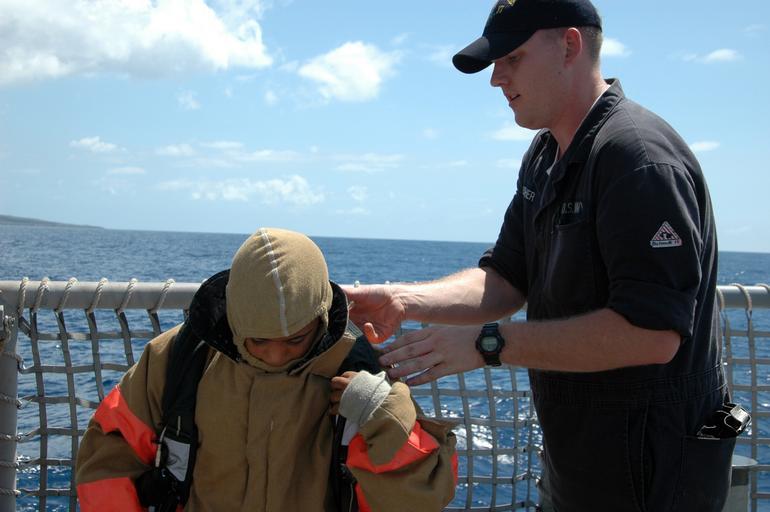 Keywords: US Navy 080912-N-9565W-070 Damage Controlman 1st Class Brandon Bower from San Ramone, Calif., helps a Navy dependent don a fire-fighting helmet during a friends and family cruise.jpg en PACIFIC OCEAN Sept 12 2008 Damage Controlman Fireman Jon Slusher from Sacramento Calif helps a Navy dependent don a fire-fighting helmet during a friends and family cruise to Maui aboard the guided-missile frigate USS Crommelin FFG 37 In addition to damage-control demonstrations more than 75 guests also experienced marlinspike seamanship gun shoots a man-overboard drill and a steel-beach picnic U S Navy photo by Senior Chief Mass Communication Specialist Melissa Weatherspoon/Released 2008-09-12 080912-N-9565W-070 Navy http //www navy mil/view_image asp id 64228 U S Navy photo by Senior Chief Mass Communication Specialist Melissa Weatherspoon PD-USGov-Military-Navy Damage Controlman USS Crommelin FFG-37 Man overboard drills Steel Beach Picnics |