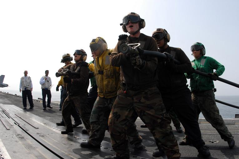 | Keywords: US Navy 080919-N-4995K-167 Aviation Boatswain's Mate (Handling) Alexis Fernandez yells commands to the hose team during flight deck drills aboard the Nimitz-class aircraft carrier USS Ronald Reagan (CVN 76).jpg en GULF OF OMAN Sept 19 2008 Aviation Boatswain's Mate Handling Alexis Fernandez yells commands to the hose team during flight deck drills aboard the Nimitz-class aircraft carrier USS Ronald Reagan CVN 76 Ronald Reagan is deployed in the U S 5th Fleet area of responsibility U S Navy photo by Mass Communication Specialist 3rd Class Chelsea Kennedy/Released 2008-09-19 080919-N-4995K-167 Navy http //www navy mil/view_image asp id 64332 U S Navy photo by Mass Communication Specialist 3rd Class Chelsea Kennedy PD-USGov-Military-Navy Aviation Boatswain's Mates Firefighting training on USS Ronald Reagan CVN-76 |
