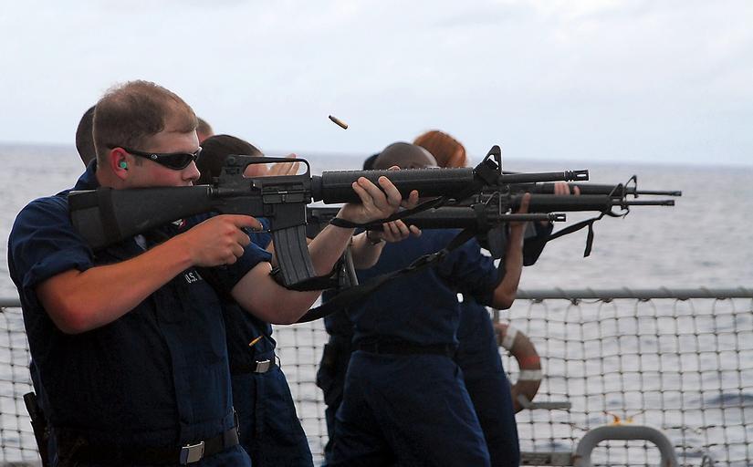 Keywords: US Navy 080930-N-2013O-001 Sonar Technician (Surface) 3rd Class Owen West, from Chataignier, La., fires an M-16 during weapons qualifications aboard the guided-millile destroyer USS Mustin (DDG 89).jpg en PACIFIC OCEAN Sept 30 2008 Sonar Technician Surface 3rd Class Owen West from Chataignier La fires an M-16 during weapons qualifications aboard the guided-millile destroyer USS Mustin DDG 89 Mustin is one of seven Arleigh Burke-class guided missile destroyers assigned to Destroyer Squadron 15 U S Navy photo by Mass Communication Specialist Seaman Charles Oki/Released 2008-09-30 080930-N-2013O-001 Navy http //www navy mil/view_image asp id 64839 U S Navy photo by Mass Communication Specialist Seaman Charles Oki PD-USGov-Military-Navy Aboard USS Mustin DDG-89 M16 rifle cartridge ejections |