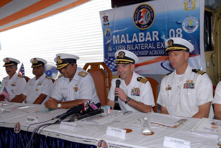 Keywords: US Navy 081018-N-1635S-008 Capt. John P. Nolan, commanding officer of the guided-missile cruiser USS Chancellorsville (CG 62), speaks alongside Rear Adm. Anil Chopra, flag officer in command of the Indian Navy's Western Fleet,.jpg en INDIAN OCEAN Oct 18 2008 Capt John P Nolan commanding officer of the guided-missile cruiser USS Chancellorsville CG 62 speaks alongside Rear Adm Anil Chopra flag officer in command of the Indian Navy's Western Fleet during an Exercise Malabar 2008 press conference aboard the Indian Navy destroyer INS Mumbai D 62 in Goa India Exercise Malabar 08 is designed to enhance the cooperative security relationship between India and the United States and increase cooperation between the Indian and U S Navy U S Navy photo by Mass Communication Specialist 3rd Class Joshua Scott/Released 2008-10-18 081018-N-1635S-008 Navy http //www navy mil/view_image asp id 65546 U S Navy photo by Mass Communication Specialist 3rd Class Joshua Scott PD-USGov-Military-Navy Malabar 2008 Naval officers of the United States USS Chancellorsville CG-62 Admirals of India Anil Chopra admiral |