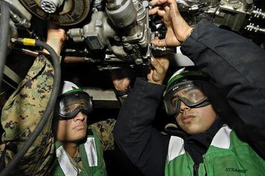 | Keywords: US Navy 081024-N-4954I-020 Lance Cpl. Abraham Cortes from Lompoc, Calif., left, assigned to Marine Aviation Logistics Squadron (MALS) 11, and Aviation Machinist's Mate Airman Jimmy Perez, from Long Beach, Calif., check electric.jpg  en PACIFIC OCEAN Oct 24 2008 Lance Cpl Abraham Cortes from Lompoc Calif left assigned to Marine Aviation Logistics Squadron MALS 11 and Aviation Machinist's Mate Airman Jimmy Perez from Long Beach Calif check electrical connectors and inspect engine leaks on the engine of an F/A-18C aircraft aboard the Nimitz-class aircraft carrier USS John C Stennis CVN 74 Stennis as part of John C Stennis Carrier Strike Group is conducting a composite training unit exercise off the coast of Southern California U S Navy photo by Mass Communication Specialist 3rd Class Bryan M Ilyankoff/Released 2008-10-24 081024-N-4954I-020 Navy http //www navy mil/view_image asp id 65784 U S Navy photo by Mass Communication Specialist 3rd Class Bryan M Ilyankoff PD-USGov-Military-Navy Aboard USS John C Stennis CVN-74 |