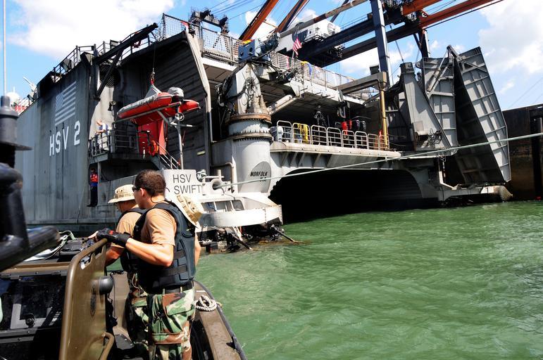 Keywords: US Navy 081217-N-9995B-001 Sailors maneuver a small boat away from high speed vessel Swift (HSV 2) in preparation for small boat operation instruction to Panamanian sailors.jpg en PANAMA CITY Panama Dec 17 2008 Sailors maneuver a small boat away from high speed vessel Swift HSV 2 in preparation for small boat operation instruction to Panamanian sailors during Southern Partnership Station Swift is the primary platform for Southern Partnership Station a military to military training mission to Central America South America and the Caribbean Basin U S Navy photo by Mass Communication Specialist 1st Class Daniel Ball Released 2008-12-17 081217-N-9995B-001 Navy http //www navy mil/view_image asp id 67465 U S Navy photo by Mass Communication Specialist 1st Class Daniel Ball PD-USGov-Military-Navy Exterior of HSV-2 Swift Southern Partnership Station 2008 Naval Base Vasco Núñez de Balboa |