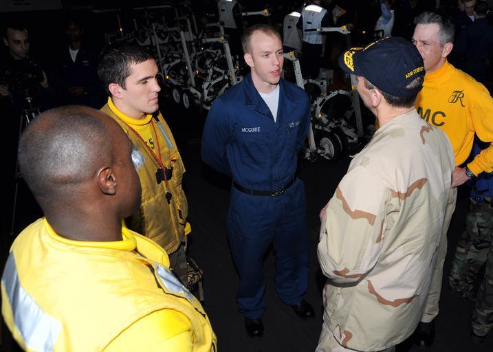 Keywords: US Navy 090119-N-7571S-004 Adm. Jonathan W. Greenert, speaks with Seaman Christopher McGuire and Aviation Boatswain's Mate (Handling) Victor Seeley and in the hangar bay during his brief visit aboard the aircraft carrier USS Th.jpg en GULF OF OMAN Jan 19 2008 Commander U S Fleet Forces Command Adm Jonathan W Greenert speaks with Seaman Christopher McGuire and Aviation Boatswain's Mate Handling Victor Seeley and in the hangar bay during his brief visit aboard the aircraft carrier USS Theodore Roosevelt CVN 71 Greenert visited Theodore Roosevelt to receive a brief on the ship's current deployment and meet her deployed Sailors Theodore Roosevelt and embarked Carrier Air Wing CVW 8 are on deployment in the U S 5th Fleet area of responsibility and are focused on reassuring regional partners of the United States' commitment to security which promotes stability and global prosperity U S Navy photo by Mass Communication Specialist 3rd Class Jonathan Snyder/Released 2008-01-19 090119-N-7571S-004 Navy http //www navy mil/view_image asp id 68123 U S Navy photo by Mass Communication Specialist 3rd Class Jonathan Snyder PD-USGov-Military-Navy Aviation Boatswain's Mates Aboard USS Theodore Roosevelt CVN-71 Jonathan W Greenert in 2009 Photographs by Jonathan Snyder |