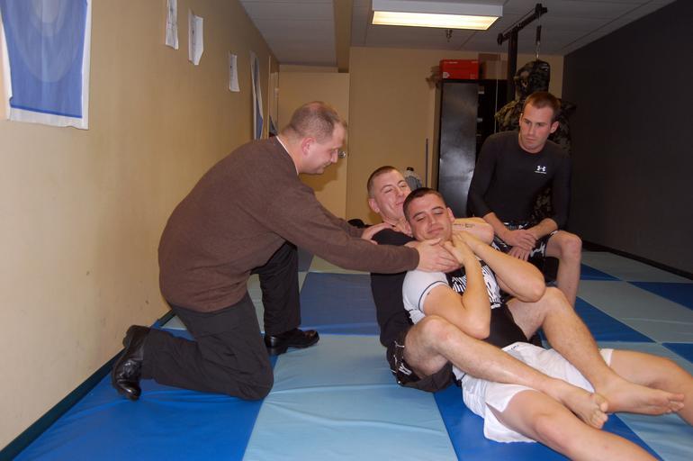 Keywords: US Navy 090124-N-2425L-002 Master-at-Arms 2nd Class Phillip Staats, from the Naval Air Station (NAS) Jacksonville Security Department instructs Aviation Structural Mechanic Airman William Mastorio on how to apply a choke hold.jpg en JACKSONVILLE Fla Jan 24 2009 Master-at-Arms 2nd Class Phillip Staats from the Naval Air Station NAS Jacksonville Security Department left instructs Aviation Structural Mechanic Airman William Mastorio on how to apply a choke hold on Aviation Machinist's Mate 3rd Class Taylor Proctor as Aviation Machinist's Mate 3rd Class Greg Baker looks on Staats is an instructor in the sport of Submission Grappling and created a team from NAS Jax that participates in tournaments throughout the state U S Navy photo by Kaylee LaRocque/Released 2009-01-24 090124-N-2425L-002 Navy http //www navy mil/view_image asp id 68620 U S Navy photo by Kaylee LaRocque PD-USGov-Military-Navy 2009 at Naval Air Station Jacksonville Master-at-arms Rear naked chokes Back mount grappling |