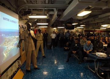 | Keywords: US Navy 090202-N-1655H-029 Senegalese Navy Lt. Cmdr. Omar Wade discusses maritime safety and security issues during a country and cultural awareness brief.jpg en ATLANTIC OCEAN Feb 2 2009 Senegalese Navy Lt Cmdr Omar Wade discusses maritime safety and security issues during a country and cultural awareness brief at an all hands call aboard the amphibious transport dock ship USS Nashville LPD 13 Nashville is deployed as a part of Africa Partnership Station 2009 an international initiative developed by Naval Forces Europe and Naval Forces Africa which aims to work cooperatively with U S and international partners to improve maritime safety and security in West and Central Africa U S Navy photo by Mass Communication Specialist David Holmes/Released 2009-02-02 090202-N-1655H-029 Navy http //www navy mil/view_image asp id 68540 U S Navy photo by Mass Communication Specialist David Holmes PD-USGov-Military-Navy Aboard USS Nashville LPD-13 Africa Partnership Station 2009 Military of Senegal |