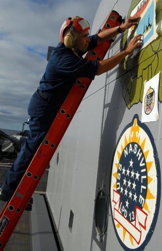 | Keywords: US Navy 090202-N-1688B-065 Aviation Boatswain's Mate Handling 3rd Class Juan Garza finishes a mural for Africa Partnership Station 2009 aboard USS Nashville (LPD 13).jpg en ATLANTIC OCEAN Feb 2 2009 Aviation Boatswain's Mate Handling 3rd Class Juan Garza finishes a mural for Africa Partnership Station 2009 on the hangar bay of the amphibious transport dock ship USS Nashville LPD 13 Nashville is deployed as a part of Africa Partnership Station 2009 an international initiative developed by Naval Forces Europe and Naval Forces Africa which aims to work cooperatively with U S and international partners to improve maritime safety and security in West and Central Africa U S Navy photo by Mass Communication Specialist 3rd Class Matthew Bookwalter/Released 2009-02-02 090202-N-1688B-065 Navy http //www navy mil/view_image asp id 68541 U S Navy photo by Mass Communication Specialist 3rd Class Matthew Bookwalter PD-USGov-Military-Navy Aviation Boatswain's Mates Aboard USS Nashville LPD-13 Africa Partnership Station 2009 |