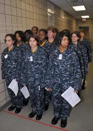 | Keywords: US Navy 090430-N-8848T-972 Female recruits wait to have their newly issued navy working uniform examined by seamstresses at Recruit Training Command.jpg  en GREAT LAKES Ill April 30 2009 Female recruits wait to have their newly issued navy working uniform examined by seamstresses at Recruit Training Command The uniform will replace the current working uniform and all present recruits will be issued the new working uniform over the next several weeks New recruits will be issued the uniform on their second day at boot camp U S Navy photo by Scott A Thornbloom/Released 2009-04-30 090430-N-8848T-972 Navy http //www navy mil/view_image asp id 71265 U S Navy photo PD-USGov-Military-Navy Recruit Training Command Great Lakes Illinois Women in the United States Navy |