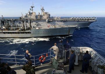 | Keywords: US Navy 090523-N-5345W-307 Sailors aboard the amphibious dock landing ship USS Fort McHenry (LSD 43) watch from the conning station as the military sealift command fleet replenishment oiler USNS John Lenthall (T-AO 189), center.jpg  en ATLANTIC OCEAN May 23 2009 Sailors aboard the amphibious dock landing ship USS Fort McHenry LSD 43 watch from the conning station as the military sealift command fleet replenishment oiler USNS John Lenthall T-AO 189 center conducts a replenishment at sea with the amphibious assault ship USS Bataan LHD 5 before Fort McHenry's approach to begin her own connected replenishment with John Lenthall Fort McHenry is on a scheduled deployment with the Bataan Amphibious Readiness Group ARG supporting maritime security operations in the U S 5th and 6th Fleet areas of responsibility U S Navy photo by Mass Communication Specialist 2nd Class Kristopher Wilson/Released 2009-05-23 090523-N-5345W-307 Navy http //www navy mil/view_image asp id 72132 U S Navy photo by Mass Communication Specialist 2nd Class Kristopher Wilson PD-USGov-Military-Navy Aboard USS Bataan LHD-5 |