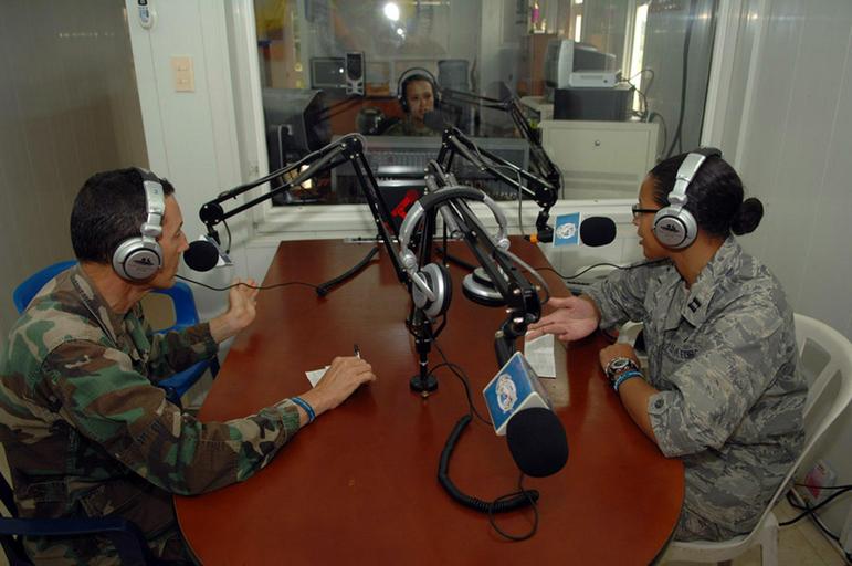 | Keywords: US Navy 090611-F-1333S-002 Air Force Capt. Andrea Beltran and Air Force Maj. Efrain Delvalle was invited to the Colombian Military Radio Station to speak on behalf of all members of Continuing Promise 2009.jpg en TUMACO Colombia June 11 2009 Air Force Capt Andrea Beltran from the 71st Medical Support Squadron Vance AFB Okla and Air Force Maj Efrain Delvalle from Patrick AFB Fla was invited to the Colombian Military Radio Station to speak on behalf of all members of Continuing Promise 2009 CP09 combines U S military and interagency personnel non-governmental organizations civil service mariners academic and partner nations to provide medical dental veterinary and engineering services afloat and ashore alongside host nation personnel U S Air Force photo by Senior Airman Jessica Snow/Released 2009-06-11 090611-F-1333S-002 Navy http //www navy mil/view_image asp id 72658 U S Air Force photo by Senior Airman Jessica Snow PD-USGov-Military-Navy Images from US Navy location TUMACO Colombia |