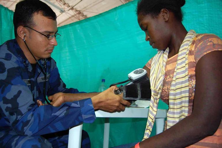 | Keywords: US Navy 090611-F-5647K-019 Lt Carlos Perez, a Nicaraguan navy doctor aboard hospital ship USNS Comfort (T-AH 20) checks a Colombian patient's blood pressure.jpg en TUMACO Colombia June 11 2009 Lt Carlos Perez a Nicaraguan navy doctor aboard hospital ship USNS Comfort T-AH 20 checks a Colombian patient's blood pressure Comfort is deployed on the four-month Continuing Promise 2009 humanitarian and civic assistance mission to Latin America and the Caribbean region Continuing Promise combines U S military and interagency personnel non-governmental organizations civil service mariners academic and partner nations to provide medical dental veterinary and engineering services afloat and ashore alongside host nation personnel U S Air Force photo by Airman 1st Class Clara Karwacinski/Released 2009-06-11 090611-F-5647K-019 Navy http //www navy mil/view_image asp id 72660 U S Air Force photo by Airman 1st Class Clara Karwacinski PD-USGov-Military-Navy Images from US Navy location TUMACO Colombia Aboard USNS Comfort T-AH-20 |