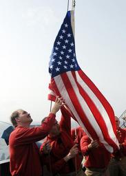 | Keywords: US Navy 090623-N-3235P-029 Chief Aviation Ordnanceman Victor Almodovar, left, helps Chief Aviation Ordnanceman Mark Seals, raise a flag honoring John Finn, the oldest living Medal of Honor recipient.jpg  en INDIAN OCEAN June 23 2009 Chief Aviation Ordnanceman Victor Almodovar left helps Chief Aviation Ordnanceman Mark Seals raise a flag honoring John Finn the oldest living Medal of Honor recipient aboard the aircraft carrier USS Dwight D Eisenhower CVN 69 The same flag will be hoisted on the mast of every U S carrier before it is given to Finn on his 100th birthday on July 23 The Eisenhower Carrier Strike Group is deployed to the U S 5th Fleet area of responsibility supporting operations Enduring Freedom and Iraqi Freedom as well as maritime security operations U S Navy photo by Mass Communication Specialist 3rd Class Nathan Parde/Released 2009-06-23 090623-N-3235P-029 Navy http //www navy mil/view_image asp id 73043 U S Navy photo by Mass Communication Specialist 3rd Class Nathan Parde PD-USGov-Military-Navy John William Finn Aviation Ordnanceman Aboard USS Dwight D Eisenhower CVN-69 Flag hoisting |