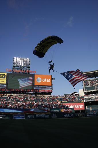 | Keywords: US Navy 090702-N-5366K-231 Chief Special Warfare Operator (SEAL) William Davis, assigned to the U.S. Navy Parachute Team the Leap Frogs, flares his canopy while flying an American flag as he makes his final approach to land.jpg en ANAHEIM Calif July 2 2009 Chief Special Warfare Operator SEAL William Davis assigned to the U S Navy Parachute Team the Leap Frogs flares his canopy while flying an American flag as he makes his final approach to land during the opening ceremony of an Anaheim Angels baseball game at Angel Stadium More than 40 000 people attended the event and were able to meet the Team after the performance The Leap Frogs are based in San Diego and perform at various locations across the country to showcase Navy excellence and raise awareness about Naval Special Warfare U S Navy photo by Mass Communication Specialist 2nd Class Michelle Kapica/Released 2009-07-02 090702-N-5366K-231 Navy http //www navy mil/view_image asp id 73453 U S Navy photo by Mass Communication Specialist 2nd Class Michelle Kapica PD-USGov-Military-Navy Angel Stadium of Anaheim 2009 Los Angeles Angels of Anaheim season United States Navy Parachute Team |