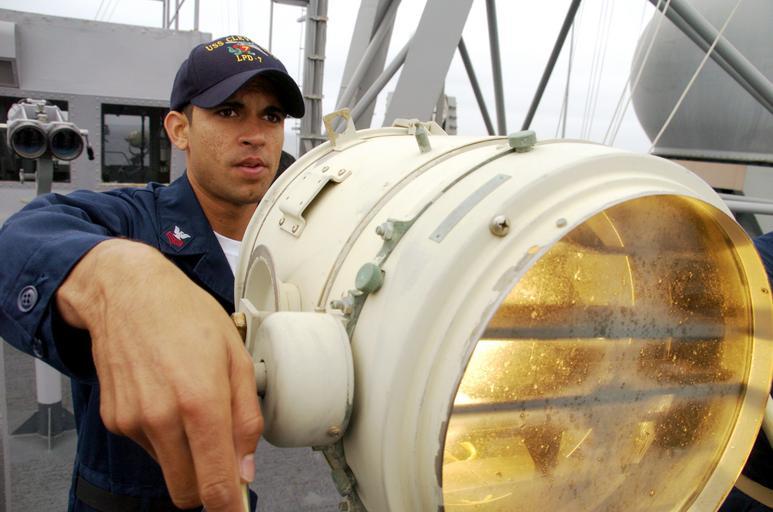 | Keywords: US Navy 090708-N-3925A-001 Quartermaster 1st Class Samir Patel uses a signal light to communicate during an underway replenishment aboard the amphibious transport dock ship USS Cleveland (LPD 7).jpg en PACIFIC OCEAN July 8 2009 Quartermaster 1st Class Samir Patel uses a signal light to communicate during an underway replenishment aboard the amphibious transport dock ship USS Cleveland LPD 7 Cleveland assigned to the Bonhomme Richard Amphibious Readiness Group is at sea conducting an initial integration exercise with the 11th Marine Expeditionary Unit 11th MEU U S Navy photo my Mass Communication Specialist 1st Class Grant P Ammon/Released 2009-07-08 090708-N-3925A-001 Navy http //www navy mil/view_image asp id 73667 U S Navy photo my Mass Communication Specialist 1st Class Grant P Ammon PD-USGov-Military-Navy Aboard USS Cleveland LPD-7 Naval signalling lamps |