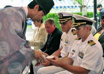 | Keywords: US Navy 090713-N-4031K-001 Commanding Officer Capt. Eric Gardner, Naval Air Facility Atsugi, Japan, accepts sake from a Shinto priest symbolizing the completion of the Navy Exchange expansion project's groundbreaking ceremony.jpg  en ATSUGI Japan July 13 2009 Commanding Officer Capt Eric Gardner Naval Air Facility Atsugi Japan accepts sake from a Shinto priest symbolizing the completion of the Navy Exchange expansion project's groundbreaking ceremony The 8 8 million project will add 1 300 sq meters to the current structure and renovate the existing 1 600 sq meters The NEX will remain open during the renovation and is scheduled to be complete by the fall of 2010 U S Navy photo by Mass Communication Specialist 2nd Class Steven Khor/Released 2009-07-13 090713-N-4031K-001 Navy http //www navy mil/view_image asp id 73736 U S Navy photo by Mass Communication Specialist 2nd Class Steven Khor PD-USGov-Military-Navy Naval Air Facility Atsugi Navy Exchanges Ground-breaking ceremonies Sake |