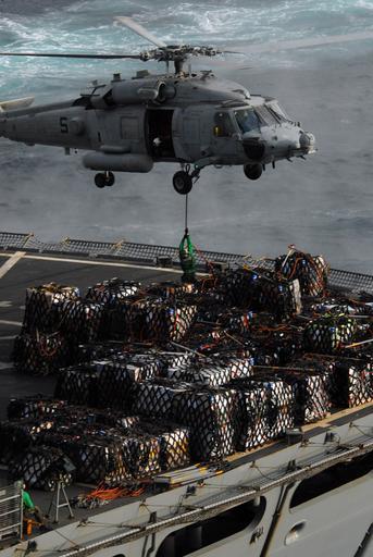 | Keywords: US Navy 090820-N-5586R-046 An MH-60S Sea Hawk helicopter assigned to the Blackjacks of Helicopter Sea Combat Squadron (HSC) 21 is loaded with cargo from the Military Sealift Command fast-combat support ship USNS Rainier (T-AOE.jpg en GULF OF OMAN Aug 20 2009 An HH-60H Sea Hawk helicopter assigned to the Black Knights of Helicopter Anti-Submarine Squadron HS 4 is loaded with cargo from the Military Sealift Command fast-combat support ship USNS Rainier T-AOE 7 for delivery to the aircraft carrier USS Ronald Reagan CVN 76 during a replenishment at sea Ronald Reagan is deployed to the U S 5th Fleet area of responsibility U S Navy photo by Mass Communication Specialist Seaman Apprentice Amanda L Ray/Released 2009-08-20 090820-N-5586R-046 Navy http //www navy mil/view_image asp id 75561 U S Navy photo by Mass Communication Specialist Seaman Apprentice Amanda L Ray PD-USGov-Military-Navy Helicopters at USS Ronald Reagan CVN-76 MH-60S Seahawk HH-60H Rescue Hawk Helicopter Sea Combat Squadron 4 United States Navy Helicopter Sea Combat Squadron 21 United States Navy |