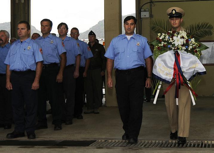 | Keywords: US Navy 090911-N-9063M-001 Chief Yeoman Christopher J. Howk, right, and Lead Firefighter Capt. Robert Zappia prepare to lay a wreath during the Naval Support Activity Souda Bay Sept. 11 memorial service.jpg en SOUDA BAY Greece Sept 11 2009 Chief Yeoman Christopher J Howk right and Lead Firefighter Capt Robert Zappia prepare to lay a wreath during the Naval Support Activity Souda Bay Sept 11 memorial service Howk was a yeoman 2nd class assigned to the Pentagon who lost many friends in the Sept 11 2001 terrorist attack that killed 59 passengers aboard American Airlines Flight 77 and 125 people inside the building U S Navy photo by Mass Communication Specialist 3rd Class John Martinez/Released 2009-09-11 090911-N-9063M-001 Navy http //www navy mil/view_image asp id 76125 U S Navy photo by Mass Communication Specialist 3rd Class John Martinez PD-USGov-Military-Navy Naval Support Activity Souda Bay Yeoman United States Navy Eighth anniversary of the September 11 2001 attacks |