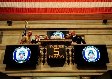 | Keywords: US Navy 091105-N-2147L-001 Cmdr. Erich Schmidt, executive officer of the amphibious transport dock ship Pre-commissioning Unit (PCU) New York (LPD 21), and crew members ring the closing bell at the New York Stock Exchange.jpg en NEW YORK Nov 5 2009 Cmdr Erich Schmidt executive officer of the amphibious transport dock ship Pre-commissioning Unit PCU New York LPD 21 and crew members ring the closing bell at the New York Stock Exchange New York is pierside and will be commissioned Nov 7 in New York City U S Navy photo by Mass Communication Specialist 1st class Corey Lewis/Released 2009-11-05 091105-N-2147L-001 Navy http //www navy mil/view_image asp id 78157 U S Navy photo by Mass Communication Specialist 1st class Corey Lewis PD-USGov-Military-Navy Images from US Navy location NEW YORK CITY New York Stock Exchange opening and closing ceremonies |