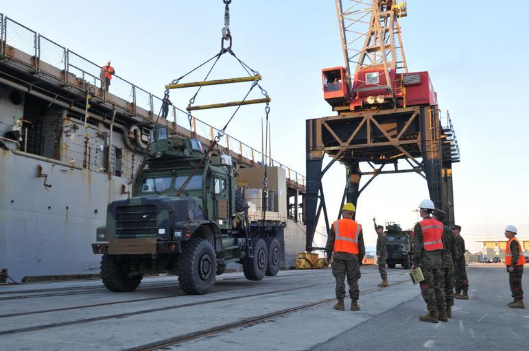 Keywords: US Navy 100115-N-1831S-073 Marines load supplies aboard USS Bataan (LHD 5).jpg en MOREHEAD CITY NC Jan 15 2010 Marines assigned to 22nd Marine Expeditionary Unit 22nd MEU load supplies aboard the multi-purpose amphibious assault ship USS Bataan LHD 5 The 22nd MEU is embarking aboard Bataan to provide relief to Haiti which was devastated by a 7 0 magnitude earthquake on Jan 12 2010 U S Navy photo by Mass Communication Specialist 3rd Class Ash Severe/Released 2010-01-15 100115-N-1831S-073 Navy http //www navy mil/view_image asp id 79976 U S Navy photo by Mass Communication Specialist 3rd Class Ash Severe PD-USGov-Military-Navy Aboard USS Bataan LHD-5 Images from US Navy location Morehead City N C Oshkosh MTVR 22nd Marine Expeditionary Unit Marine Corps Transparent Armor Gun Shield