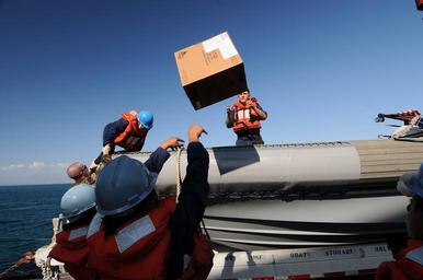 Keywords: US Navy 100118-N-7923C-005 Hospital Corpsman 1st Class Robert Lemon, assigned to Maritime Civil Affairs Team (MCAT) 203, helps load food and medical supplies aboard a rigid hull inflatable boat.jpg en PORT-AU-PRINCE Haiti Jan 18 2010 Sailors aboard the amphibious dock landing ship USS Gunston Hall LSD 44 load food and medical supplies aboard a rigid hull inflatable boat aboard the amphibious dock landing ship USS Gunston Hall LSD 44 The supplies are bound for the Killick Haitian Coast Guard Base Gunston Hall arrived in Haiti Jan 18 to begin humanitarian relief operations as part of Operation Unified Response U S Navy photo by Lt j g Rick Chernitzer/Released 2010-01-18 100118-N-7923C-005 Navy http //www navy mil/view_image asp id 80150 U S Navy photo by Lt j g Rick Chernitzer PD-USGov-Military-Navy Aboard USS Gunston Hall LSD-44 |