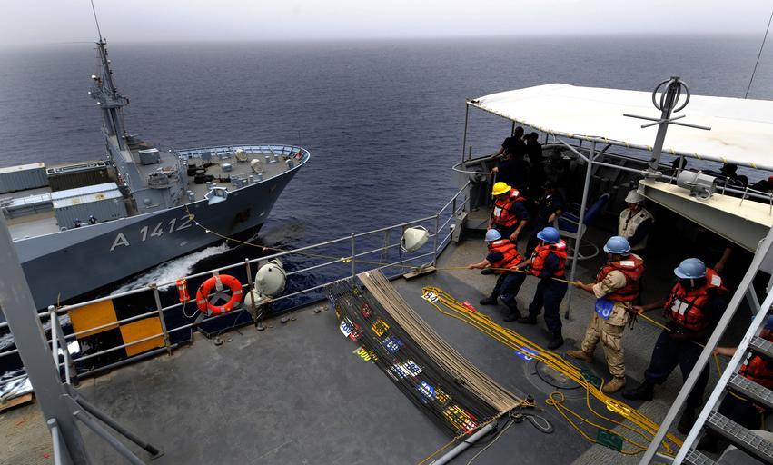 | Keywords: US Navy 100324-N-7948C-286 Sailors assigned the Whidbey Island-class amphibious dock-landing ship USS Gunston Hall (LSD 44) heave on a phone-and-distance line.jpg en GULF OF GUINEA March 24 2010 Sailors assigned the Whidbey Island-class amphibious dock-landing ship USS Gunston Hall LSD 44 heave on a phone-and-distance line during an underway replenishment with the German navy Type 702 Berlin-class combat support ship Frankfurt Am Main A 1427 is pulled in during an underway replenishment Gunston Hall is deployed as part of Africa Partnership Station West an international initiative developed by Naval Forces Europe and Naval Forces Africa to improve maritime safety and security on the African continent U S Navy photo by Mass Communication Specialist 1st Class Martine Cuaron/Released 2010-03-24 100324-N-7948C-286 Navy http //www navy mil/view_image asp id 83636 U S Navy photo by Mass Communication Specialist 1st Class Martine Cuaron PD-USGov-Military-Navy Aboard USS Gunston Hall LSD-44 A1412 Frankfurt am Main ship 2002 Africa Partnership Station 2010 Bundeswehr in 2010 |
