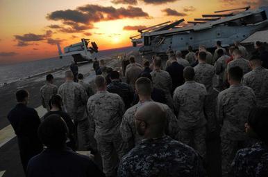 | Keywords: US Navy 100404-N-5700G-056 Sailors and Marines gather on the flight deck of the amphibious assault ship USS Nassau (LHA 4) at sunrise to participate in an Easter sunrise service.jpg en U S 5TH FLEET AREA OF RESPONSIBILITY April 4 2010 Sailors and Marines gather on the flight deck of the amphibious assault ship USS Nassau LHA 4 at sunrise to participate in an Easter sunrise service Nassau is the command platform for the Nassau Amphibious Ready Group supporting maritime security operations and theater security cooperation operations in the U S 5th Fleet area of responsibility U S Navy photo by Mass Communication Specialist 3rd Class Desiree Green/Released 2010-04-04 100404-N-5700G-056 Navy http //www navy mil/view_image asp id 84318 U S Navy photo by Mass Communication Specialist 3rd Class Desiree Green PD-USGov-Military-Navy Aboard USS Nassau LHA-4 |