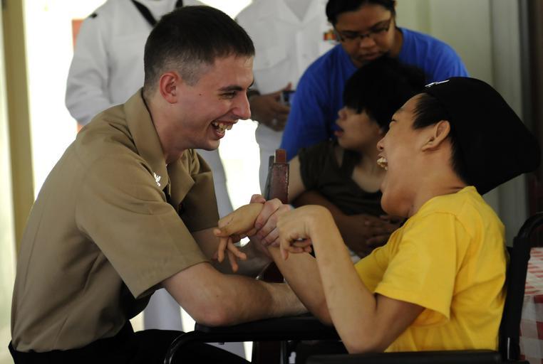| Keywords: US Navy 100405-N-0864H-345 Operations Specialist 2nd Class Matthew McComb talks with a child at the Rumah Bakti Harapan home during community relations project.jpg en KOTA KINABALU Malaysia April 5 2010 Operations Specialist 2nd Class Matthew McComb assigned to the U S 7th Fleet command ship USS Blue Ridge LCC 19 talks with a child at the Rumah Bakti Harapan home during community relations project U S Navy photo by Mass Communication Specialist/Released 2010-04-05 100405-N-0864H-345 Navy http //www navy mil/view_image asp id 84010 U S Navy photo by Mass Communication Specialist PD-USGov-Military-Navy Aboard USS Blue Ridge LCC-19 Operations Specialist United States Navy |