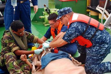 | Keywords: US Navy 100422-N-1401J-115 Medical give emergency first aid to an injured sailor aboard a foreign vessel.jpg en INDIAN OCEAN April 22 2010 Royal Navy Leading Medical Assistant Richard Bastianpulle left Hospital Corpsman 3rd Class Adam Delatorre and Culinary Specialist 1st Class Matthew West all three assigned to commands on Diego Garcia give emergency first aid to an injured sailor aboard a foreign vessel The sailor was later sent to Branch Health Clinic Diego Garcia for further treatment U S Navy photo by Mass Communication Specialist Seaman Christopher S Johnson/Released 2010-04-22 100422-N-1401J-115 Navy http //www navy mil/view_image asp id 84720 U S Navy photo by Mass Communication Specialist Seaman Christopher S Johnson PD-USGov-Military-Navy Indian Ocean First aid treatment |