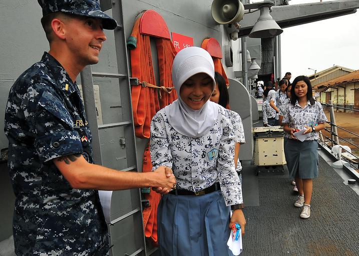 | Keywords: US Navy 100527-N-7643B-206 Ensign Jason Fischer thanks an Indonesian high school student for coming aboard the guided-missile frigate USS Vandegrift (FFG 48) for a tour of the ship.jpg en SURABAYA Indonesia May 27 2010 Ensign Jason Fischer thanks an Indonesian high school student for coming aboard the guided-missile frigate USS Vandegrift FFG 48 for a tour of the ship Sailors from Vandegrift gave a tour of their ship to local high school students as part of Naval Engagement Activity Indonesia 2010 Naval Engagement Activity is part of the Cooperation Afloat Readiness and Training CARAT series of bilateral exercises held annually in Southeast Asia to strengthen relationships and enhance force readiness U S Navy photo by Mass Communication Specialist 2nd Class David A Brandenburg/Released U S Navy photo by Mass Communication Specialist 2nd Class David A Brandenburg/Released 2010-05-27 100527-N-7643B-206 Navy http //www navy mil/view_image asp id 86095 U S Navy photo by Mass Communication Specialist 2nd Class David A Brandenburg PD-USGov-Military-Navy USS Vandegrift FFG-48 Cooperation Afloat Readiness and Training 2010 |