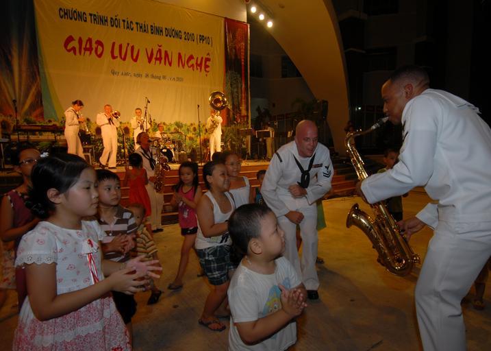 Keywords: US Navy 100608-N-0209M-020 U.S. Pacific Fleet Band members play and dance with Vietnamese children during a concert at the Nha Van Hoa Lao Dong cultural center in Quy Nhon, Vietnam, supporting Pacific Partnership 2010.jpg en QUY NHON Vietnam June 8 2010 U S Pacific Fleet Band members play and dance with Vietnamese children during a concert at the Nha Van Hoa Lao Dong cultural center in Quy Nhon Vietnam supporting Pacific Partnership 2010 The Military Sealift Command hospital ship USNS Mercy T-AH 19 is in Vietnam conducting Pacific Partnership 2010 the fifth in a series of annual U S Pacific Fleet humanitarian and civic assistance endeavors to strengthen regional partnerships U S Navy photo by Mass Communication Specialist 3rd Class Joshua Martin/Released 2010-06-08 100608-N-0209M-020 Navy http //www navy mil/view_image asp id 86894 U S Navy photo by Mass Communication Specialist 3rd Class Joshua Martin PD-USGov-Military-Navy Aboard USNS Mercy T-AH-19 People of Quy Nhon Social work in Vietnam Relations of the United States and Vietnam |