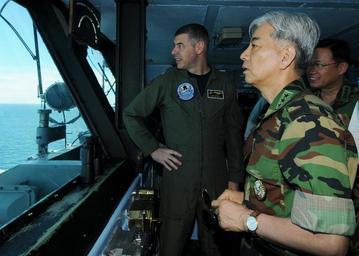 Keywords: US Navy 100726-N-4830B-062 Gen. Min Goo Han discusses ship formations with Capt. Daniel Grieco.jpg en EAST SEA July 26 2010 Gen Min Goo Han chairman of the Joint Chiefs of Staff for the Republic of Korea discusses ship formations with Capt Daniel Grieco executive officer of the aircraft carrier USS George Washington CVN 73 on the ship's flag bridge The Republic of Korea and the United States are conducting the combined alliance maritime and air readiness exercise Invincible Spirit in the seas east of the Korean peninsula from July 25-28 2010 This is the first in a series of joint military exercises that will occur over the coming months in the East and West Seas U S Navy photo by Mass Communication Specialist 3rd Class Danielle A Brandt/Released 2010-07-26 100726-N-4830B-062 Navy http //www navy mil/view_image asp id 89403 U S Navy photo by Mass Communication Specialist 3rd Class Danielle A Brandt PD-USGov-Military-Navy Aboard USS George Washington CVN-73 Han Min-goo |