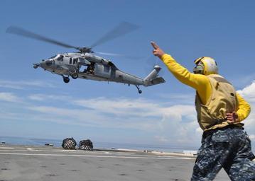 Keywords: US Navy 101009-N-3620B-037 Aviation Boatswain's Mate (Fuel) Airman Adam M. Pond signals to an MH-60S Sea Hawk helicopter to take off after dropping.jpg en PACIFIC OCEAN Oct 9 2010 Aviation Boatswain's Mate Fuel Airman Adam M Pond signals to an MH-60S Sea Hawk helicopter assigned to the Island Knights of Helicopter Sea Combat Squadron HSC 25 to take off after dropping cargo on the flight deck of the amphibious transport dock USS Denver LPD 9 Denver is part of the permanently forward-deployed Essex Amphibious Ready Group and is underway for a scheduled patrol in the western Pacific Ocean U S Navy photo by Mass Communciation Specialist 3rd Class Bryan Blair/Released 2010-10-09 101009-N-3620B-037 Navy http //www navy mil/view_image asp id 92597 U S Navy photo by Mass Communciation Specialist 3rd Class Bryan Blair PD-USGov-Military-Navy Aboard USS Denver LPD-9 Helicopter Sea Combat Squadron 25 United States Navy |