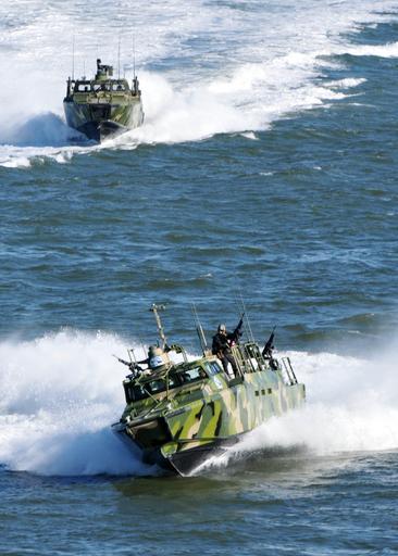 | Keywords: US Navy 101022-N-9565D-190 Sailors assigned to Riverine Group 1 stand their post aboard Riverine Command Boat (Experimental) (RCB-X).jpg  en NORFOLK Oct 22 2010 Sailors assigned to Riverine Group 1 stand their post aboard Riverine Command Boat Experimental RCB-X as the boat conducts turning maneuvers while being followed by Riverine Command Boat RBC-1 at Naval Station Norfolk The RCB-X is powered by an alternative fuel blend of 50 percent algae-based and 50 percent NATO F-76 fuels to support the Secretary of the Navy's efforts to reduce total energy consumption on naval ships U S Navy photo by Mass Communication Specialist 2nd Class Clifford L H Davis/Released 2010-10-22 101022-N-9565D-190 Navy http //www navy mil/view_image asp id 93228 U S Navy photo by Mass Communication Specialist 2nd Class Clifford L H Davis PD-USGov-Military-Navy Naval Station Norfolk Riverine command boat |