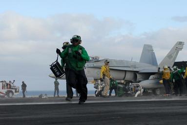 Keywords: US Navy 101110-N-5684M-074 Aviation Boatswain's Mate (Equipment) Airman Kla Brownell, from Baltimore, Md., runs with a weight board across the bow.jpg en PACIFIC OCEAN Nov 10 2010 Aviation Boatswain's Mate Equipment Airman Kla Brownell from Baltimore Md runs with a weight board across the bow catapults aboard the aircraft carrier USS Ronald Reagan CVN 76 Ronald Reagan is underway completing a composite training unit exercise in preparation for an upcoming deployment U S Navy photo by Mass Communication Specialist 3rd Class Dylan McCord/Released 2010-11-10 101110-N-5684M-074 Navy http //www navy mil/view_image asp id 94060 U S Navy photo by Mass Communication Specialist 3rd Class Dylan McCord PD-USGov-Military-Navy Aboard USS Ronald Reagan CVN-76 Flight deck of USS Ronald Reagan CVN-76 |