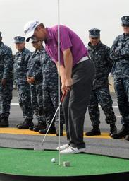 | Keywords: US Navy 110125-N-4590G-084 Professional golfer Bryce Molder putts on the flight deck of the aircraft carrier USS Ronald Reagan (CVN 76).jpg en SAN DIEGO Jan 25 2011 Professional golfer Bryce Molder putts on the flight deck of the aircraft carrier USS Ronald Reagan CVN 76 The putting challenge was part of Play for L A an 18-day promotional event culminating in the Northern Trust Open golf tournament on February 15 Ronald Reagan is at homeport in San Diego preparing for an upcoming deployment U S Navy photo by Mass Communication Specialist Seaman Nicholas A Groesch/Released 2011-01-25 110125-N-4590G-084 Navy http //www navy mil/view_image asp id 96777 U S Navy photo by Mass Communication Specialist Seaman Nicholas A Groesch PD-USGov-Military-Navy Guests aboard USS Ronald Reagan CVN-76 |