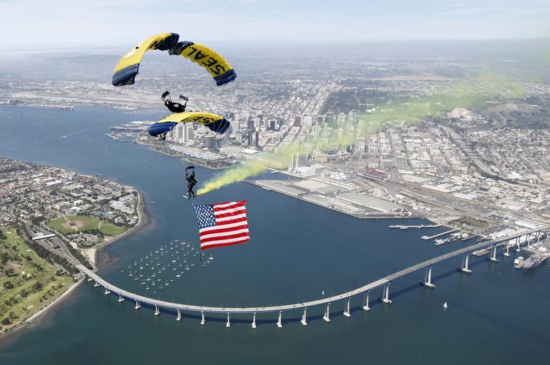 Keywords: US Navy 110316-N-0000W-254 Members of the U.S. Navy parachute demonstration team, the Leap Frogs, perform a T-formation during a training jump abov.jpg en CORONADO Calif March 16 2011 Members of the U S Navy parachute demonstration team the Leap Frogs perform a T-formation during a training jump above Naval Amphibious Base Coronado The team is stationed in Coronado and performs demonstrations across the country in support of Naval Special Warfare and Navy recruiting U S Navy photo by James Woods/Released 2011-03-16 110316-N-0000W-254 Navy http //www navy mil/view_image asp id 98630 U S Navy photo by James Woods PD-USGov-Military-Navy Aerial views of San Diego-Coronado Bridge Aerial photographs of Coronado California United States Navy Parachute Team Aerial photographs of San Diego