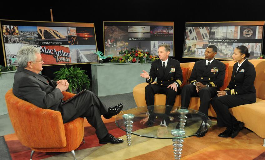 Keywords: US Navy 110330-N-00332-112 Bob Batcher interviews Capt. William Hart and other senior leadership at WHRO Public Media about community involvement.jpg en NORFOLK March 30 2011 Bob Batcher host of Norfolk Perspectives interviews Capt William Hart left commanding officer of the aircraft carrier USS Theodore Roosevelt CVN 71 Cmdr Richard Jones mini boss and Lt Cmdr Karen Eifert the ship's public affairs officer at WHRO Public Media about the ship's recent involvement with children in the Norfolk community Theodore Roosevelt is undergoing refueling complex overhaul at Northrop Grumman Newport News Shipbuilding in Newport News Va U S Navy photo by Mass Communication Specialist Seaman Apprentice Cory Asato/Released 2011-03-30 110330-N-00332-112 Navy http //www navy mil/view_image asp id 99400 U S Navy photo by Mass Communication Specialist Seaman Apprentice Cory Asato PD-USGov-Military-Navy Aboard USS Theodore Roosevelt CVN-71 |